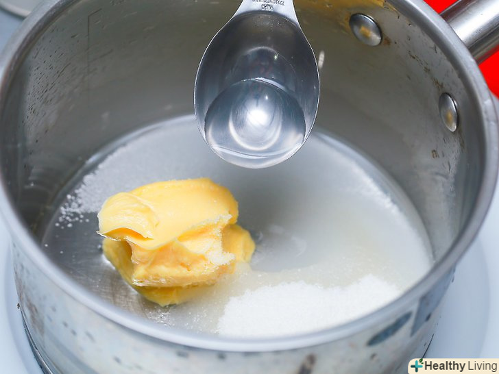 У невеликій каструлі змішайте 50 грам масла, 55 грам цукрової пудри і дві столові ложки води і поставте на середній вогонь, але не доводьте до кипіння.розмішуйте, поки не розчиниться цукор.