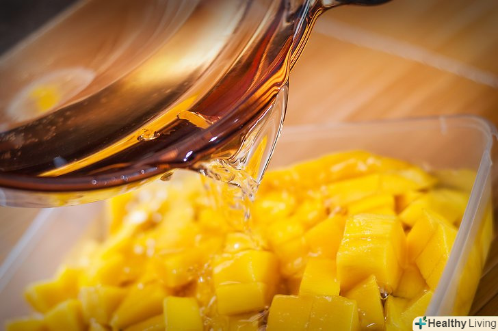 Влийте простий сироп на шматочки манго.залиште простір приблизно в 2.5 см для розширення.