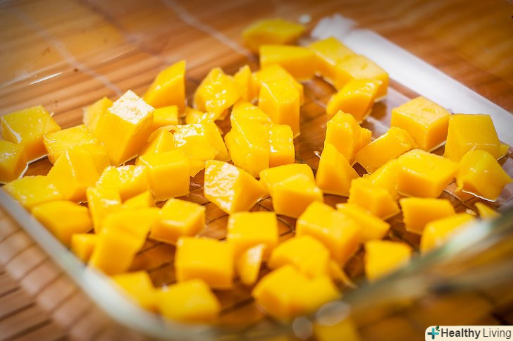Помістіть шматочки на лист.переконайтеся, що шматочки не торкаються один одного, так як дуже складно розділити заморожені манго.- Дуже зручно, якщо у листа є краї або вигнута частина на краях, щоб шматочки не впали. В якості заміни можете використовувати неглибоку каструлю.