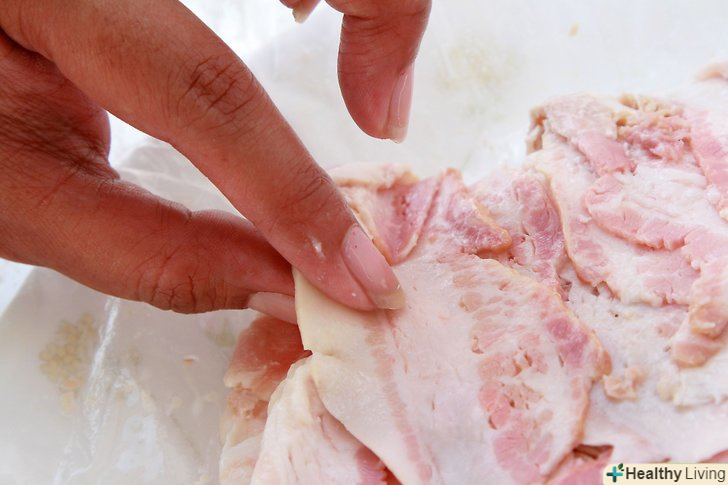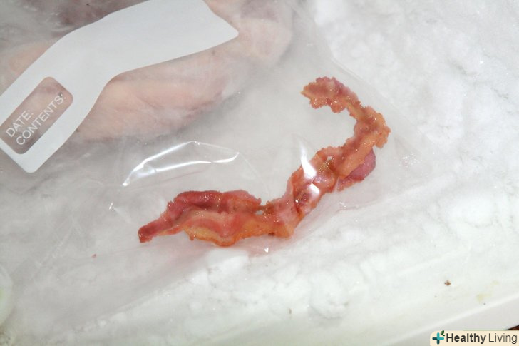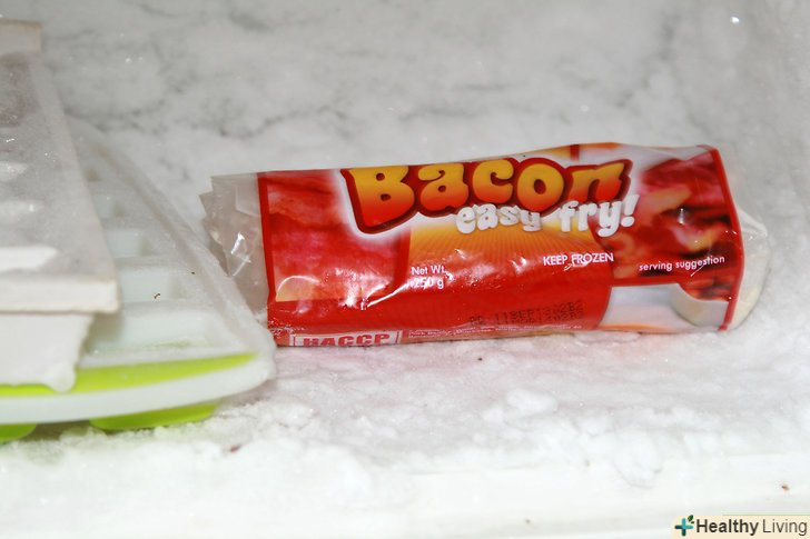 Слідкуйте за замороженим беконом.якщо він буде перебувати в морозильній камері занадто довго, жировий прошарок почне протухати. На додаток до всього, кінчики придбають коричневий відтінок, стануть жовтими і неїстівними. В такому випадку їх необхідно зрізати, і приготувати бекон як зазвичай. Але якщо раптом ви помітите неприємний запах не їжте його ні в якому разі.- Великі шматки бекону погано заморожуються. У них занадто багато солі, через що жир почне протухати ще швидше. Щоб заморозити великий шматок бекону, розріжте його на менші шматочки.