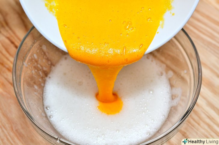 Перемішайте суміші яєць. Повільно додайте суміш жовтків до білків. Вам потрібно зберегти пишність білків.