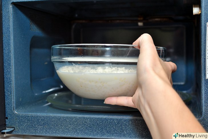 Поставте молоко з рисом в мікрохвильову піч на 1 хвилину 20 секунд.тривалість може відрізнятися в залежності від печі.