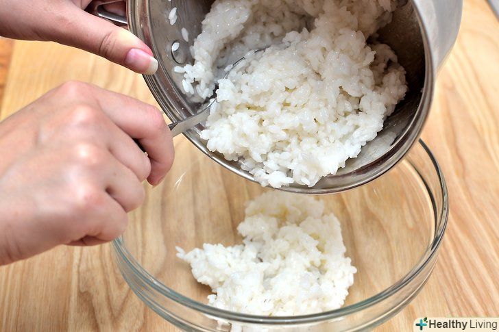 Викладіть зварений рис в ємність для мікрохвильової печі.покладіть достатню кількість для однієї порції; або приблизно 2/3 глибокої тарілки.