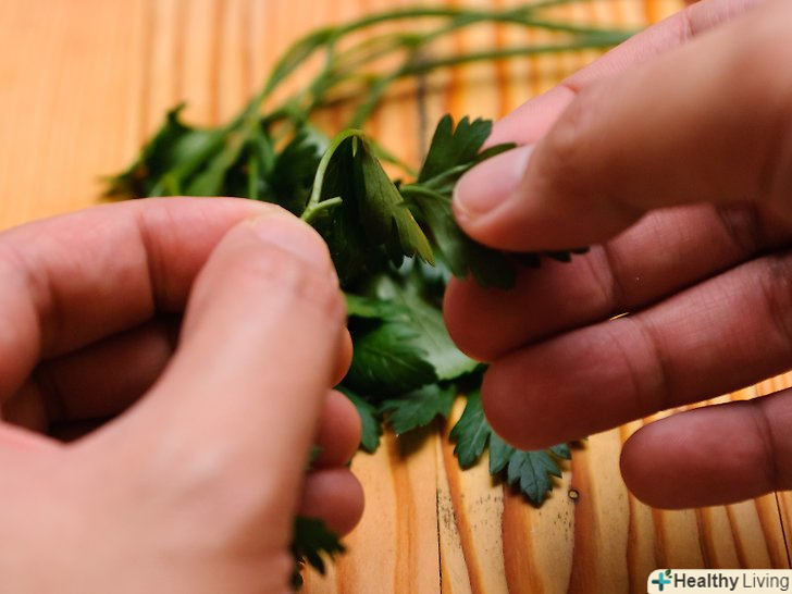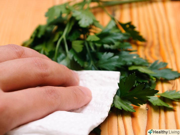 Помийте петрушку.обполосніть її в холодній воді і залиште просохнути. Щоб петрушка висохла швидше, поплескайте пучком по паперовому рушнику. Робіть це акуратно, щоб листя не порвалися або не пом'ялися.