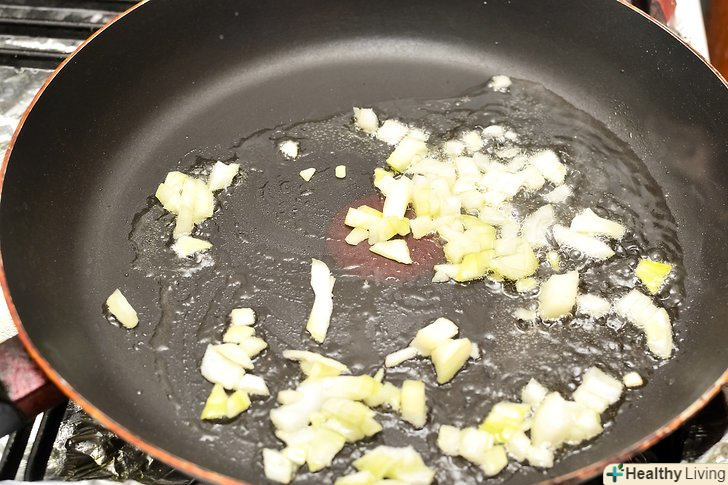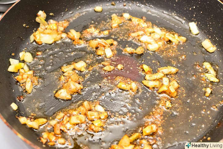 Обсмажте дрібно нарізану цибулю і часник.нагрійте в антипригарній сковороді або каструлі рослинне масло і обсмажте в ньому цибулю і часник до м'якості і злегка коричневого кольору.