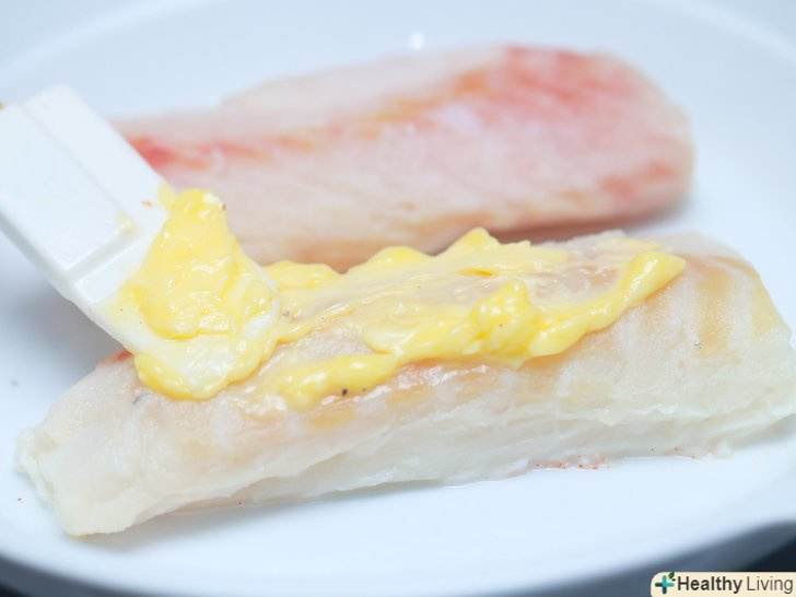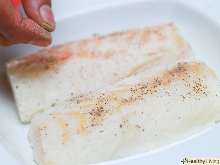 Злегка приправте обидві сторони філе сіллю і перцем. візьміть невелику миску і насипте в неї по 1-2 чайної ложки солі і перцю. Перемішайте суміш і акуратно посипте кожен шматок філе з обох сторін. Немає "правильної" кількості солі та перцю, яку Ви обов'язково повинні використовувати. Якщо ви сумніваєтеся, краще взяти менше - ви завжди зможете додати солі і перцю перед подачею готового блюда. Покладіть приправлені шматочки філе в посуд для запікання.- Якщо у вас є кошерна сіль або сіль грубого помелу, використовуйте її замість звичайної дрібної солі. Великі крупиці солі розчиняються повільніше, завдяки чому сіль розподіляється в філе більш рівномірно.