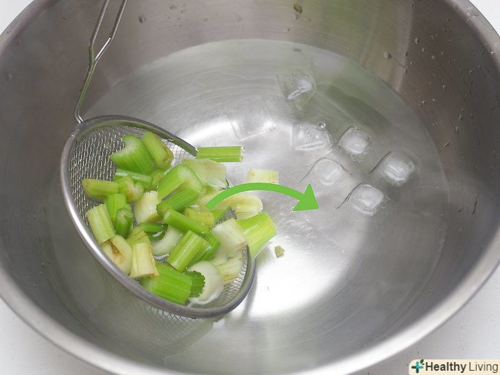 Вийміть селеру з киплячої води і помістіть в холодну воду. коли пройде 3 хвилини, селера слід витягти з води. Відразу перекладіть його у велику миску з холодною водою, щоб овочі перестали готуватися. Залиште в холодній воді ще на 3 хвилини. [6]- Якщо ви не хочете набирати в каструлю холодну воду, то перекладіть селера в друшляк і поставте під проточну холодну воду, щоб він скоріше охолов.