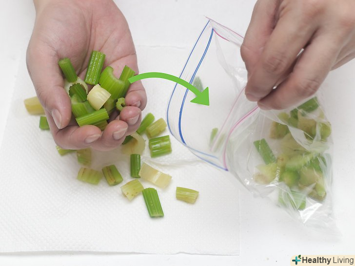 Перекладіть селера в підходящу ємність. коли овочі висохнуть, розділіть їх на порції по 250 грамів. Перекладіть в підходящу ємність на зразок пластикового контейнера або пакетів для заморозки. [8]- Не заповнюйте контейнер під зав'язку, оскільки овочі всередині ємності будуть розширюватися.