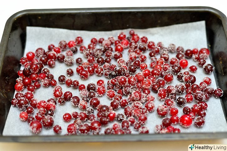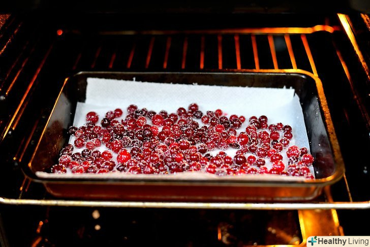 Постеліть пергамент на деко. рівномірно розподіліть ягоди по деку, переконайтеся, що вони не лежать один на одному. В іншому випадку вони злипнуться разом, створюючи великі журавлинні грудки.