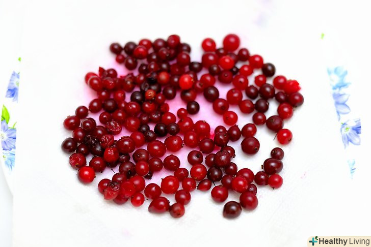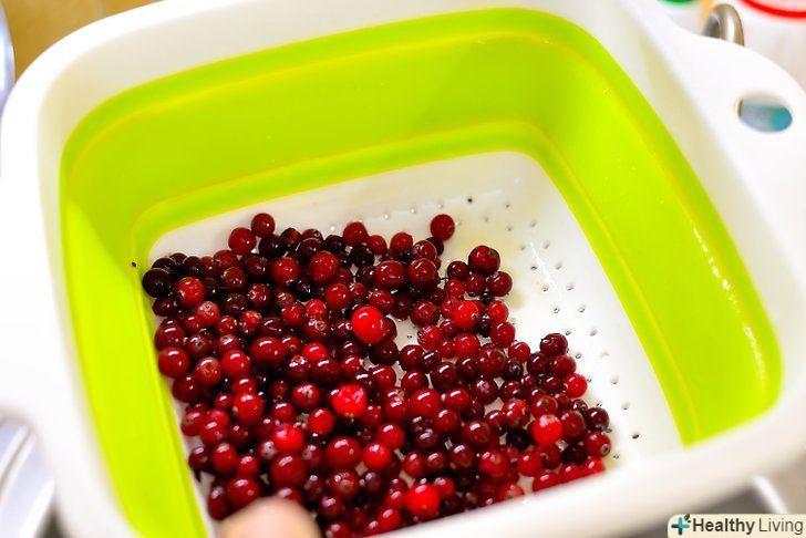 Насипте 350 г свіжої журавлини в друшляк. промийте під холодною водою, після цього потрясіть друшляк, щоб вода висохла. Висипте журавлину на паперові рушники і приберіть всі старі і пошкоджені ягоди. [1]