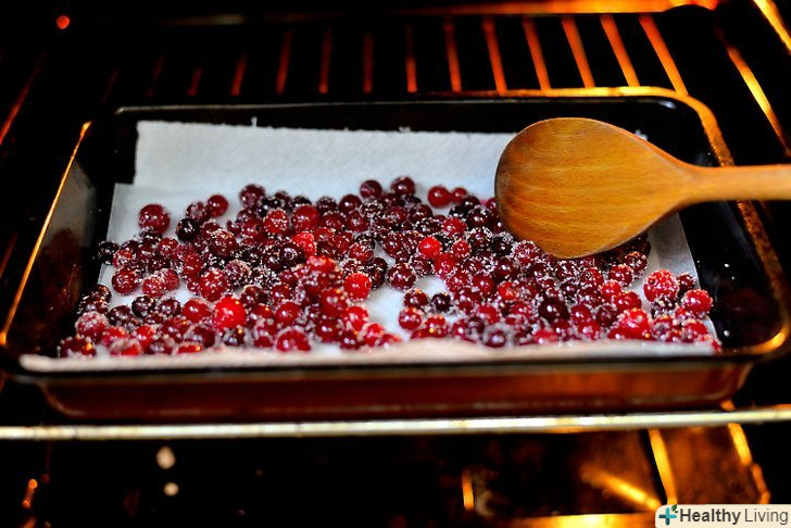 Підготуйте ще один деко. цей Ви поставите в духовку. Постеліть на нього шар паперових рушників, після цього поверх них постеліть пергаментний папір для запікання. Розподіліть журавлину рівномірно по поверхні пергаменту.