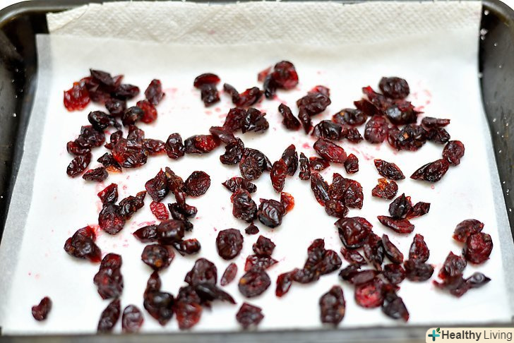 Знизьте температуру до 65 градусів. помістіть журавлину в духовку і почекайте. Процес сушіння займе 6-10 годин, в залежності від потужності духовки і сухості ягоди. Це також залежить від того, чи хочете ви отримати ягоду суху або хрустку. Якщо ви хочете, щоб ягоду можна було жувати, почекайте близько 6 годин. [3]