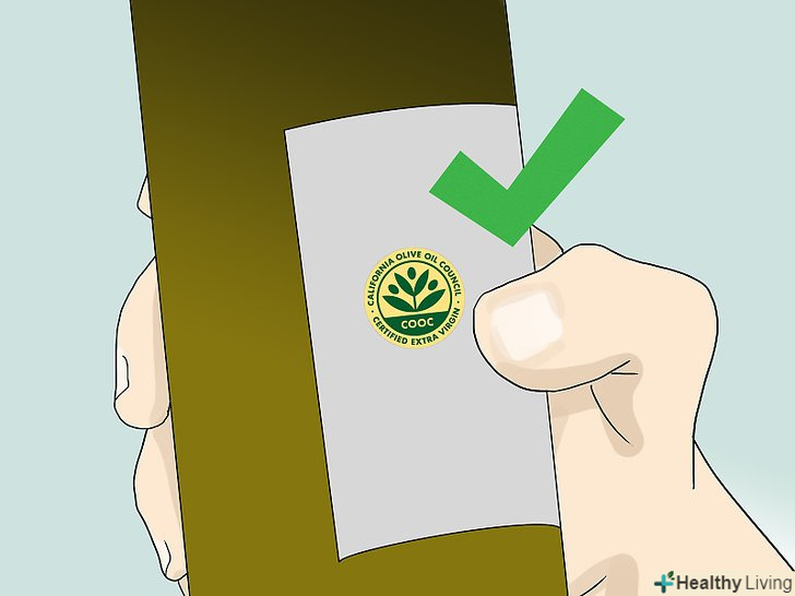 Переконайтеся в наявності знака якості. десь на етикетці повинен стояти знак якості однієї з організацій з виробництва оливкової олії. Наприклад, оливкові олії з Іспанії, Італії, Греції та інших країн Європи повинні мати маркування DOP (PDO). Це збільшує шанси на якість масла. Виробники, які відповідають цим стандартам, більш схильні чесно відображати таку інформацію, як дата збору врожаю. [3]- Знак якості зазвичай розміщують на задній частині пляшки оливкової олії.