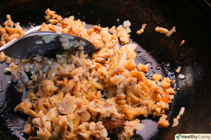 Готуйте нарізані гриби і цибулю на сковороді до м'якості. додайте свіжі трави за вашим вибором (трави також наріжте). Традиційною добавкою є петрушка.