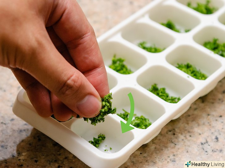 Розкладіть нарізану петрушку в формочці для кубиків льоду і додайте трохи води в кожну клітинку. Будьте обережні і не переборщіть з водою. Як варіант, можна розфасувати нарізану петрушку в маленькі пакетики для заморожування.