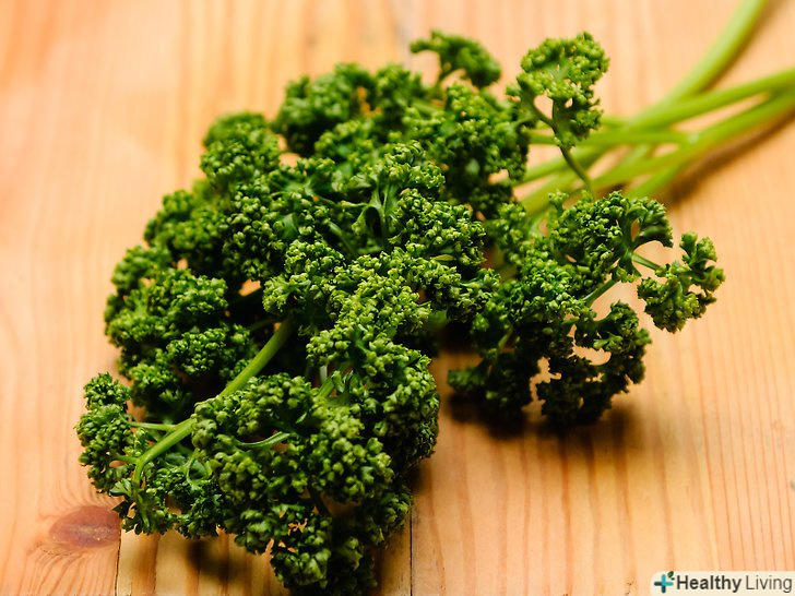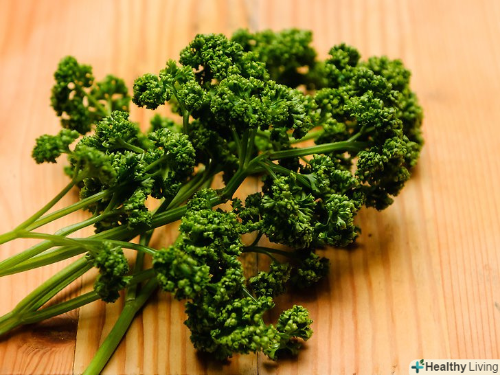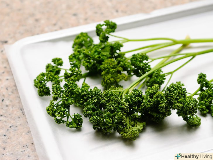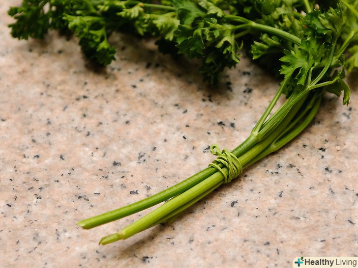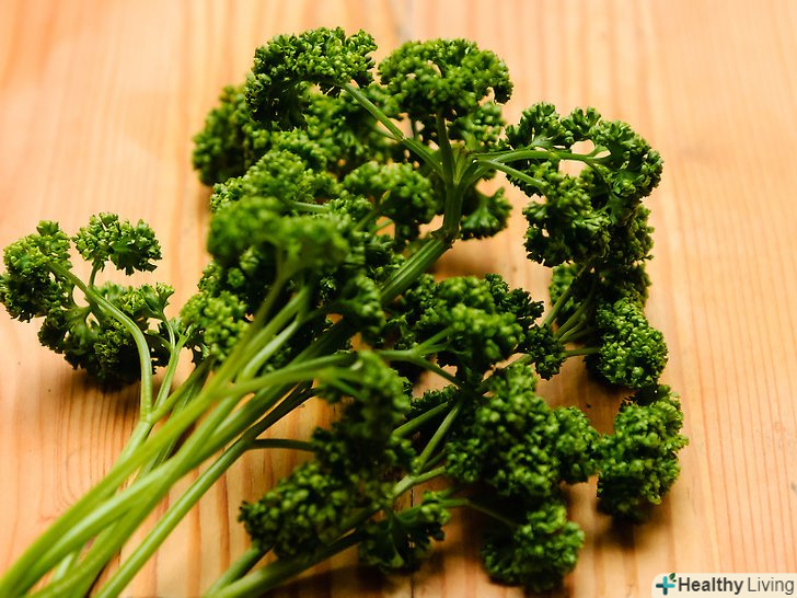 Зберіть свіжу петрушку з вашого городу. Зберіть петрушку до того, як на ній зацвітуть перші бутончики. Зривайте її вранці, але після того, як висохне роса.В цей час доби петрушка максимально ароматна; полуденна спека погіршує смакові якості рослини. Крім того, купуйте свіжу петрушку в місцевому продуктовому магазині. Вибирайте яскраво-зелені пучки, красивого вигляду і зі свіжим запахом. Не купуйте зморщену, коричневу, запліснявілу або підсохлу зелень. Акуратно зріжте петрушку на довгих стеблах і будьте обережні, щоб не пом'яти листя.