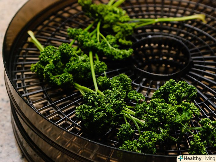 Викладіть петрушку на піднос рівним шаром. залиште зазори між гілочками і поставте піднос в сушарку. Так ви забезпечите рівномірну циркуляцію повітря навколо петрушки.