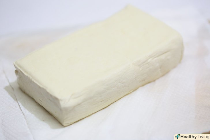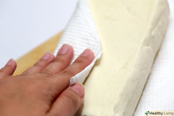 Видавіть зайву вологу. після розморожування в тофу збережеться багато вологи. Обережно видавіть зайву рідину з тофу, користуючись паперовими рушниками або чимось аналогічним. [8]- Якщо вам потрібно видавити зайву вологу з великої кількості тофу, то покладіть шматок тофу між двома тарілками, а потім поставте що-небудь важке на верхню тарілку.