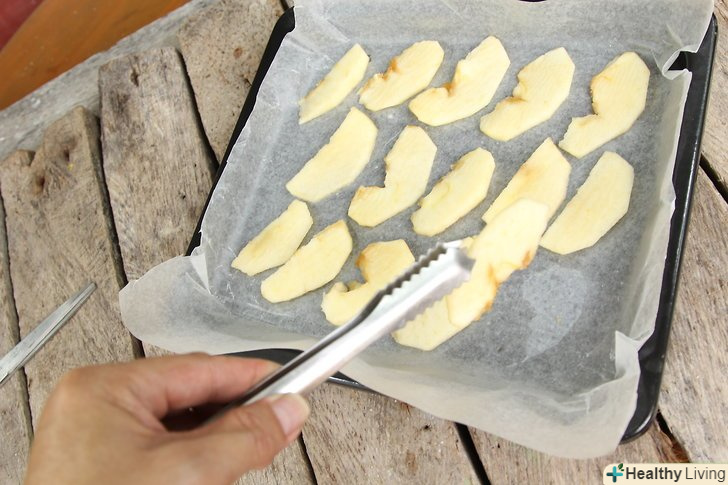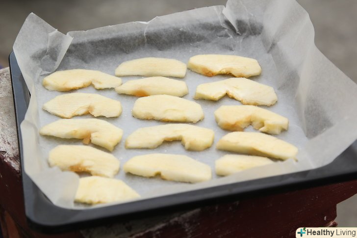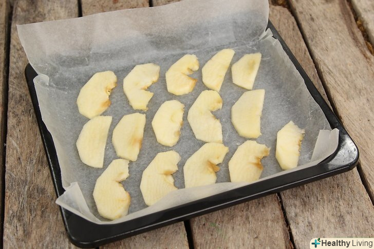 Поставте духовку на 90-95 градусів.покладіть яблучні скибочки на пергамент поверх дека. Перевірте, щоб скибочки не склеїлися, інакше під час сушіння вони так і сплавляться.[4]
