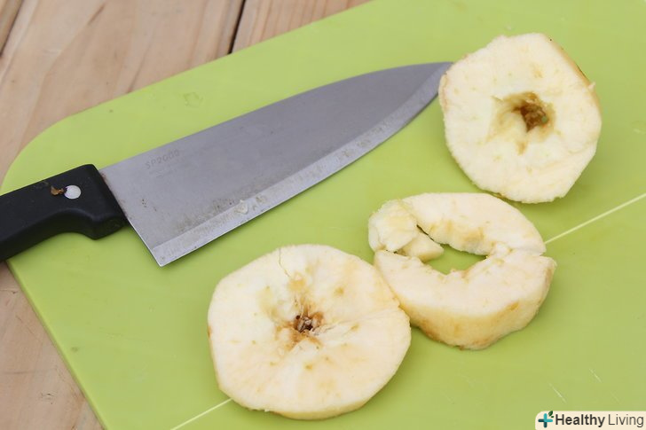 Виріжте серединки.також приберіть всі червиві місця, якщо такі будуть. У магазинах кухонного начиння можна знайти пристосування, які легко вирізують серединки. У будь-якому випадку, навіть якщо у вас немає такого інструменту, ви можете вирізати серединки вручну.[1]- Якщо ви будете використовувати ці яблука для прикрас, або вам важливо, щоб їжа виглядала якомога красивіше, пропустіть етап вирізання серединки. Порізані на кола яблука, з яких серединка не прибрана, мають гарний візерунок зірочкою, що виходить якраз через серединки.