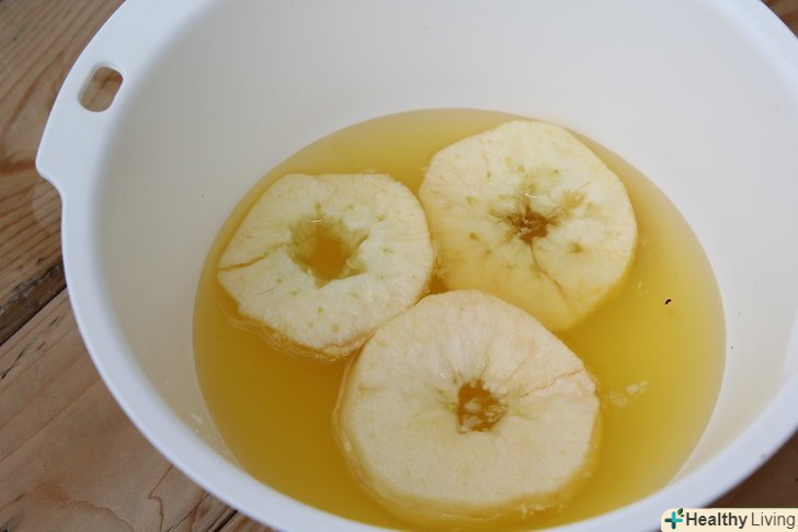 Занурте скибочки в рідину, яка збереже яблука від коричневого кольору.відмінний розчин для цих цілей виходить, якщо змішати лимонний сік, ананасовий сік і воду разом. Ананасовий сік необов'язковий, проте він додасть солодощі і підкреслить кислинку лимонного.[2]- Ви також можете додати апельсиновий і лимонний соки і перемішати їх з водою.