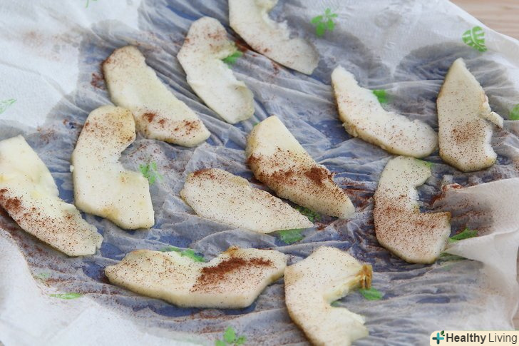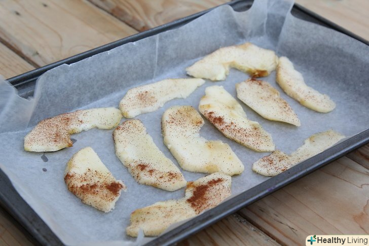 Посипте спеції на скибочки (за бажанням).деяким подобається надавати яблукам аромат за допомогою спецій мускатного горіха, кориці або запашного перцю. Це виведе смак яблук на новий рівень, проте яблука без спецій не менш смачні.[3]
