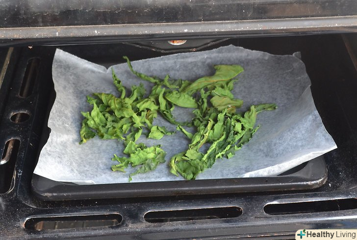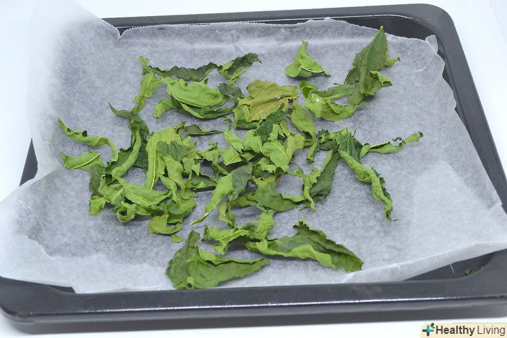 Рівномірно розподіліть листя на деку.не збивайте листя в купу-викладіть їх рівним шаром. При необхідності запікайте чіпси декількома партіями. Якщо листя будуть лежати один на одному, то можуть запітніти і розм'якнути.[4]