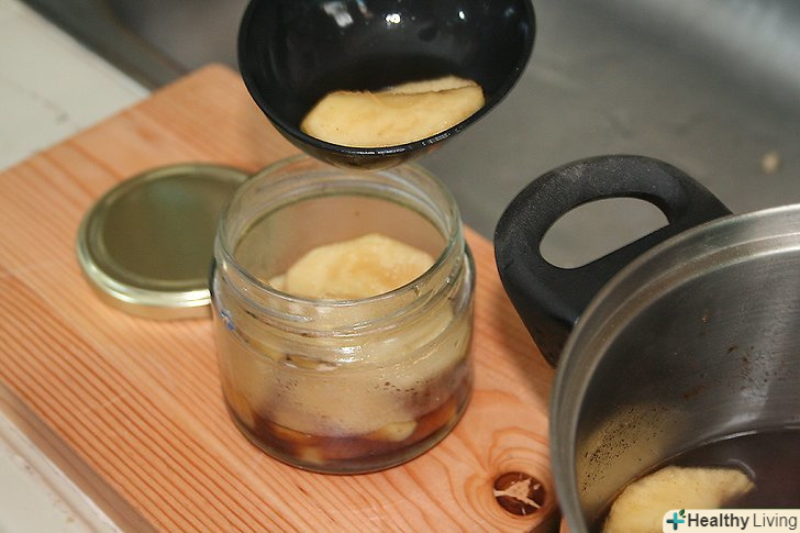 Заповніть банки сиропом, щоб у вас залишалося близько 1 см від кришки.заповнивши банки, закрийте їх кришками. Щоб стерилізувати кришки, ви можете перевернути банку, поки фрукти ще гарячі, але для кращих результатів краще обробити банки і кришки перед тим, як їх заповнювати.