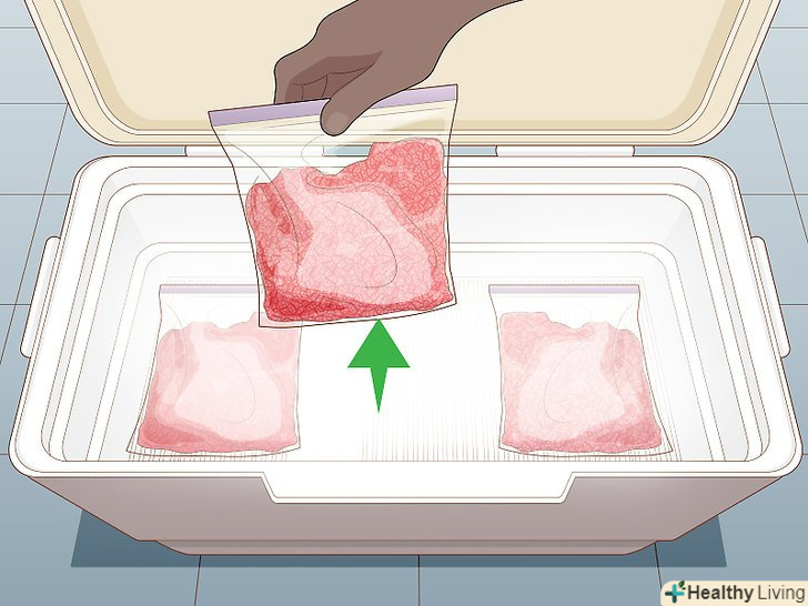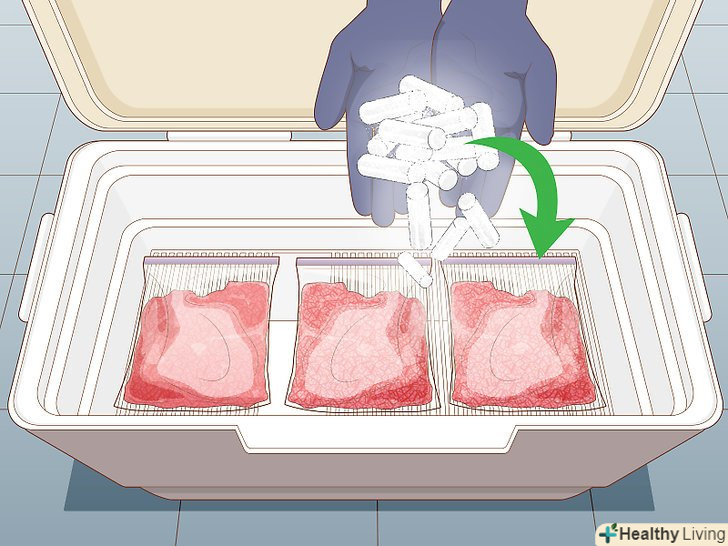 Складіть пакети у велику ємність для заморозки з товстими стінками.покрийте продукти шаром сухого льоду.- Одягніть рукавички і одяг з довгими рукавами, коли будете брати сухий лід.