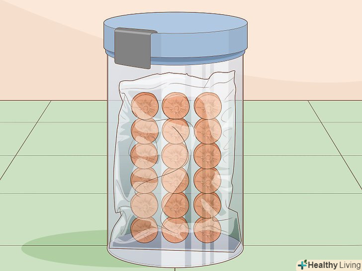 Складіть їжу на зберігання.після того як продукт повністю висох, помістіть його в пакети для заморозки. Вичавіть повітря, закрийте пакети і зберігайте їх в морозилці, коморі або в наборі першої необхідності.