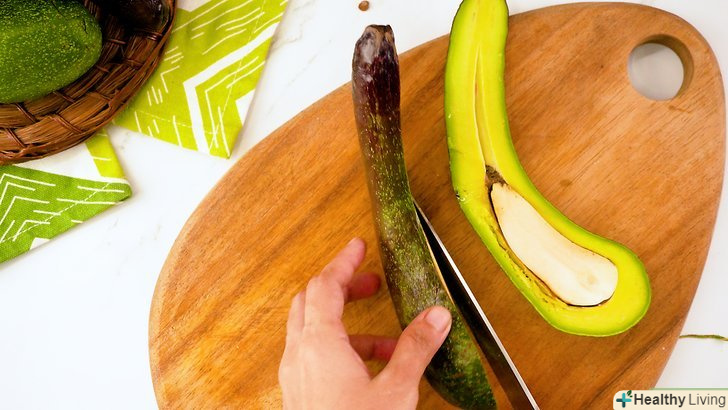 Розріжте авокадо навпіл і видаліть кісточку і шкірку.якщо заморозити авокадо цілком, кісточка і шкірка змінять його смак і аромат, коли ви розморозити його. Щоб уникнути цього, розріжте авокадо навпіл кухонним ножем і витягніть кісточку ложкою або кінчиком ножа. Зніміть з авокадо шкірку пальцями або ножем.[15]Порада: як правило, зі стиглого авокадо шкірку зняти досить легко. Вона зісковзує при легкому натисканні. Якщо авокадо нестиглий, вам, можливо, доведеться зрізати шкірку ножем.