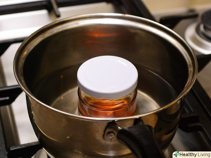 Опустіть мед у воду.поставте банку на дно по центру каструлі, щоб вона була з усіх боків оточена водою.- Якщо ви накрили банку кришкою, переконайтеся, що вона закрита не щільно. Потрібно щоб вода не потрапляла всередину, але повітря могло вільно виходити з банки. Якщо закрити кришку щільно, зросле всередині тиск може розірвати банку.