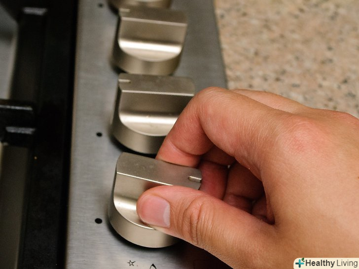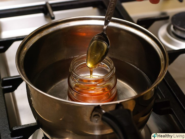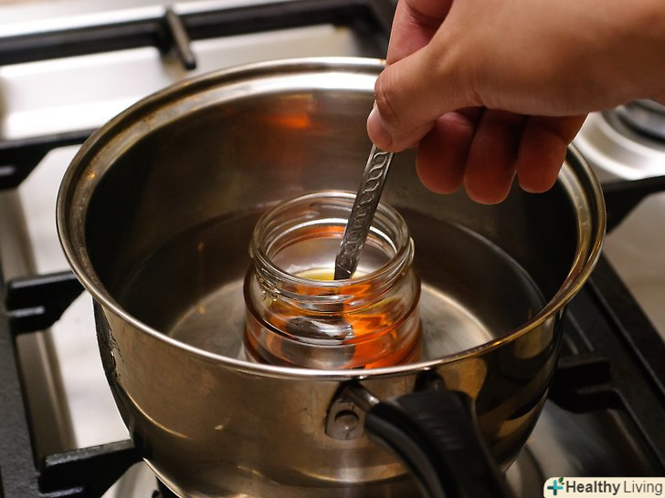 Зніміть каструлю з вогню.після того як вода трохи покипить, зніміть каструлю з плити і поставте на жароміцну поверхню.- Або, можна залишити каструлю на плиті і просто зробити слабкий вогонь. Перш ніж ставити банку з медом у воду, дочекайтеся, поки кипіння припиниться. Мед не стане неїстівним через перегрів, але нагрів вище 38 градусів Цельсія може зруйнувати корисні речовини, що містяться в меді.