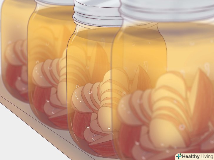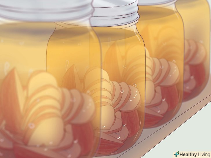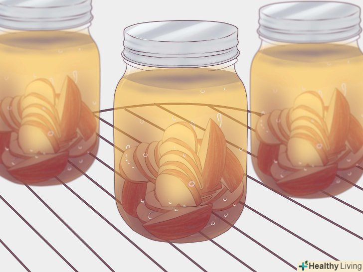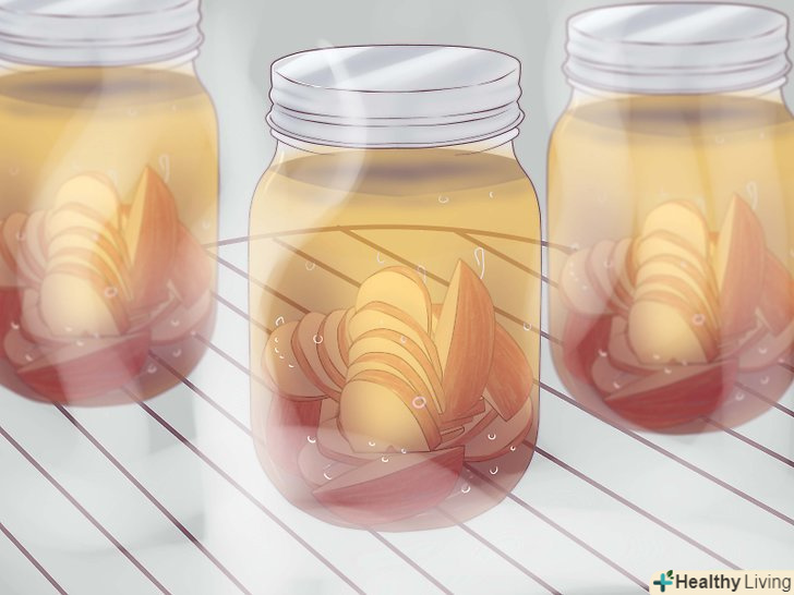 Заповніть чисті банки промитими і підготовленими фруктами.залийте фрукти цукровим сиропом, залишаючи 2.5 см повітряного простору у верхній частині банки. Посувайте банки, щоб бульбашки повітря пішли.- Якщо ви хочете використовувати метод теплового закочування замість консервування сирих фруктів, додайте фрукти в цукровий сироп, доведіть до кипіння, варіть плоди 2 -3 хвилини і відразу ж заповніть банки.