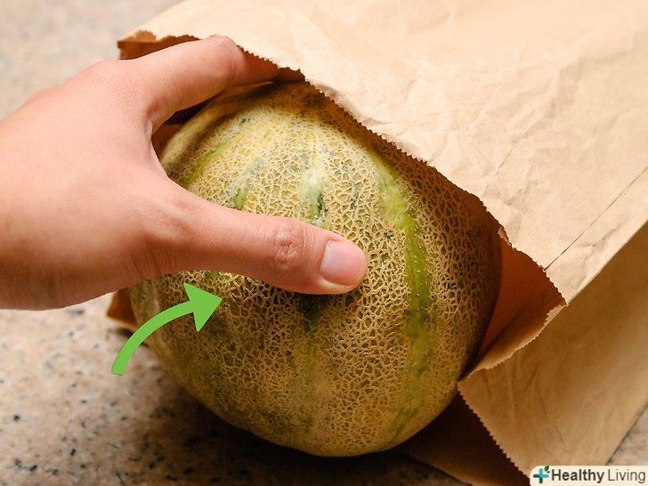 Помістіть диню в коричневий паперовий пакет. [4] Візьміть досить великий пакет, щоб туди помістилася диня і залишився простір. Потрібно залишити невеликий простір всередині пакета для циркуляції повітря.- Закрийте пакет перш, ніж залишати диню дозрівати в ньому.