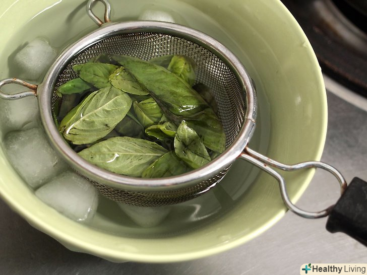 Киньте листя базиліка в воду і бланшируйте їх 5-10 секунд.Будьте дуже уважні і не бланшуйте їх довше зазначеного часу. Переставте каструлю на іншу конфорку, щоб вона охолола якомога швидше.