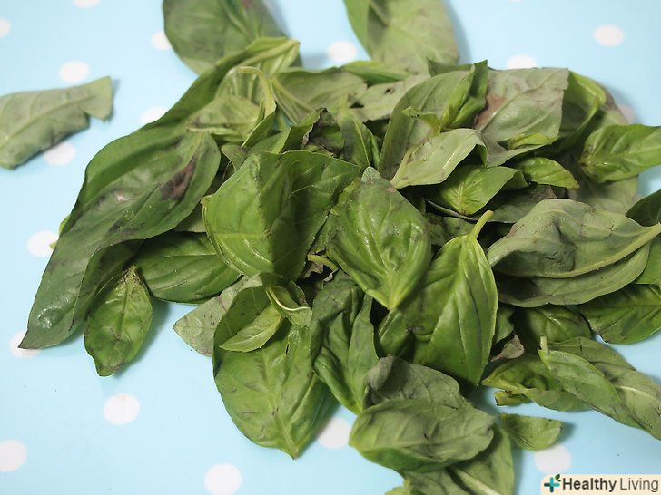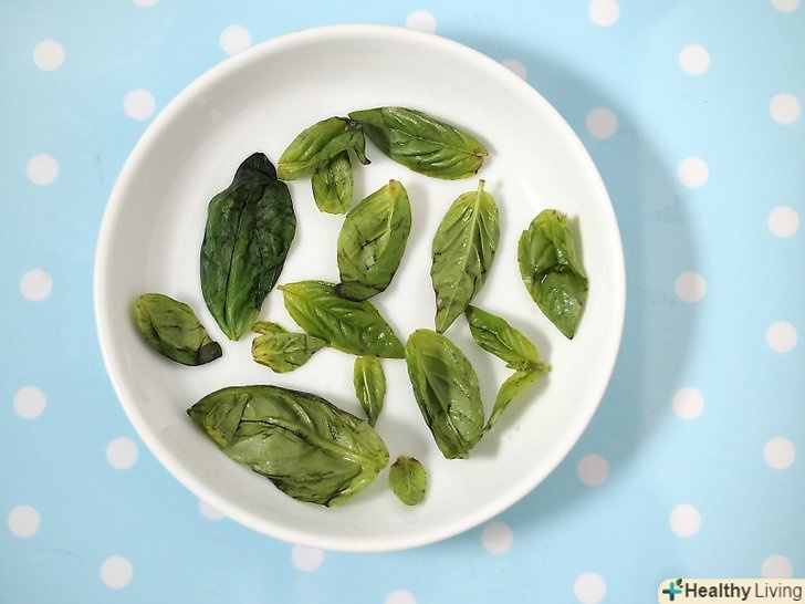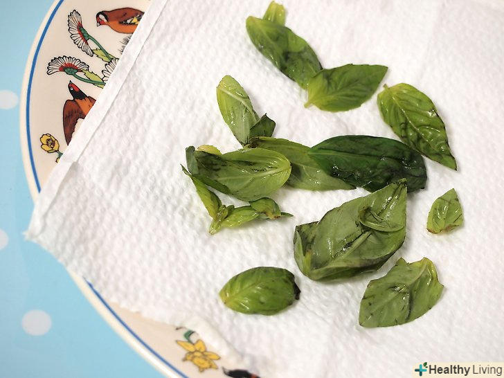 Сполосніть базилік в холодній проточній воді.також можна покласти базилік в посудину з холодною водою і дати йому насититися вологою. Просушіть базилік. Відкиньте базилік в друшляк і дайте гарненько просохнути.- Акуратно промакніте базилік паперовим рушником. Базилік дуже ніжний, тому обережно промокніть листя паперовим рушником, або залиште його лежати на рушнику, поки вода не висохне.
