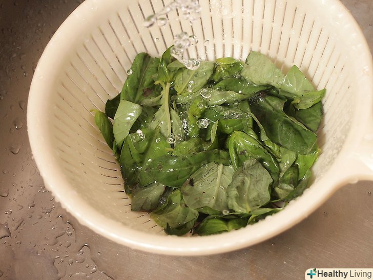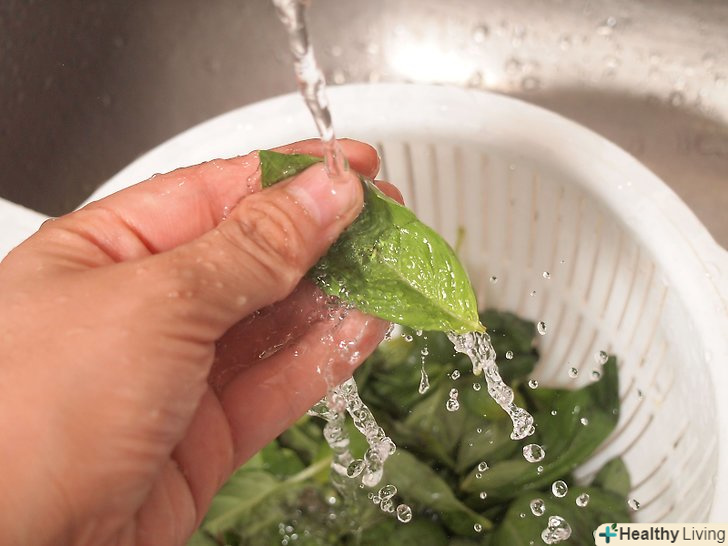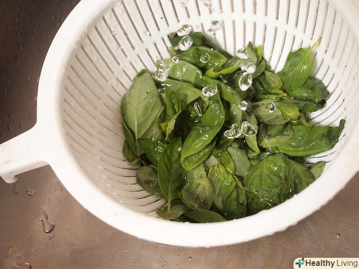 Ретельно сполосніть базилік в холодній воді.для максимальної ефективності можете використовувати овочерізку (салат). Якщо її у вас немає, сполосніть базилік в посудині з водою і висушіть за допомогою паперових рушників.