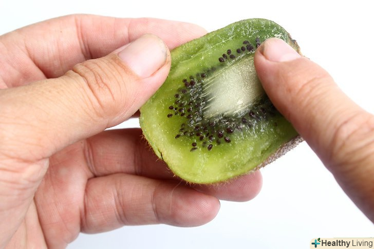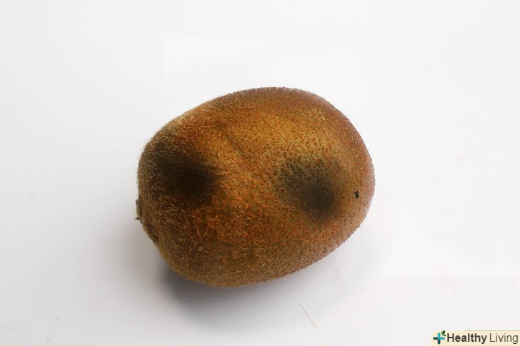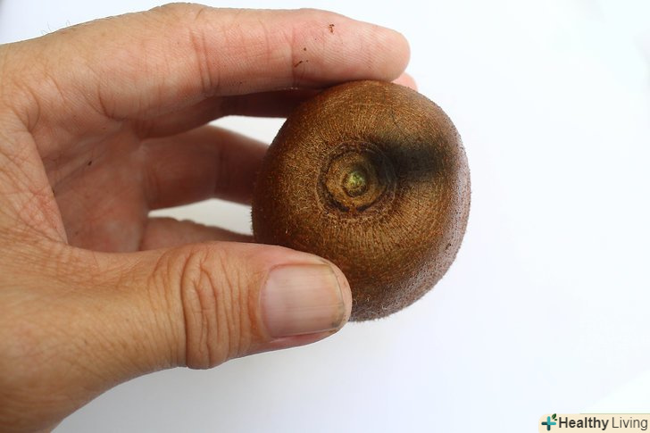Помацайте ківі, щоб визначити, тверде воно або м'яке.спробуйте ківі на дотик, злегка стиснувши плід пальцями. Якщо ківі дуже тверде, ймовірно, воно ще нестигле і йому треба трохи полежати, або воно вже зіпсувалося. Якщо ківі на дотик занадто м'яке і водянисте, воно зіпсувалося.[4]- Якщо куплене вами ківі дуже тверде, ви можете довести його до стиглості. Для цього ківі треба на кілька днів покласти поруч з бананами або яблуками. Можливо, ківі дозріє і стане більш м'яким.
