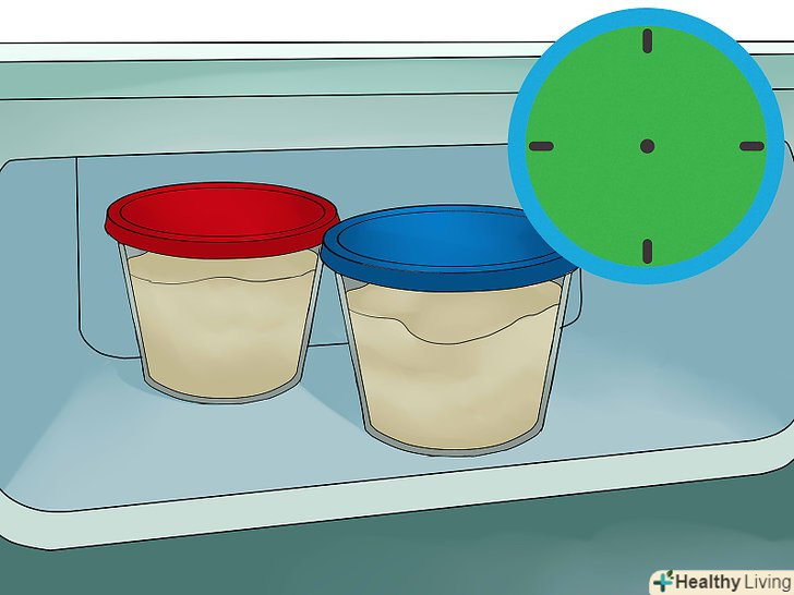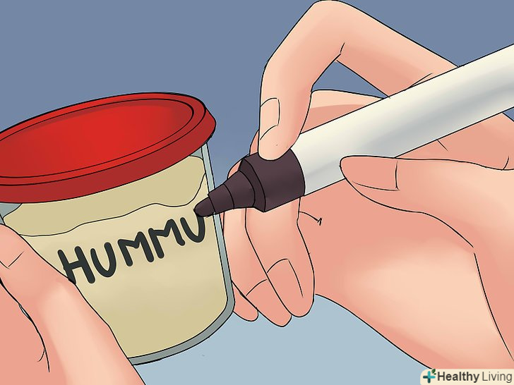 Промаркуйте і поставте дату на контейнерах.найкраще зробити це перманентним маркером. Підпишіть "хумус" і вкажіть день, місяць і рік, коли ви поставили його в морозилку. Це дозволить відстежувати тривалість заморозки і дотримуватися термінів зберігання.[6]- Якщо в подальшому ви плануєте використовувати цей пластиковий контейнер для зберігання інших продуктів, можна наклеїти на нього смужку скотча. Напишіть назву продукту і дату на скотчі, а коли хумус закінчиться, зніміть і викиньте наклейку.