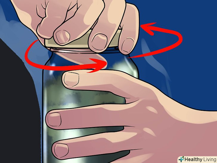 Із зусиллям прокрутіть кришку.надійно візьміть банку неосновною рукою. Якщо кришка виявиться занадто гарячою, щоб до неї можна було спокійно доторкнутися, для захисту рук накиньте на неї кухонний рушник. Основною рукою міцно схопіть кришку банки і проверніть її в напрямку проти годинникової стрілки.- Якщо кришка не піддасться, перед черговою спробою накиньте на неї гумову рукавичку або кухонний рушник. Це повинно допомогти розкрити банку, так як захоплення стане міцніше через додаткового тертя.