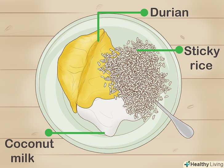 Сервіруйте дуріан з клейким рисом і кокосовим молоком. покладіть в миску свіжоприготований клейкий рис. Помістіть на рис кілька скибочок свіжого дуріана і полийте все кокосовим молоком. Щоб блюдо було більш солодким, можна злегка підсолодити кокосове молоко.[10]- Крім дуріана можна додати манго та інші свіжі фрукти.