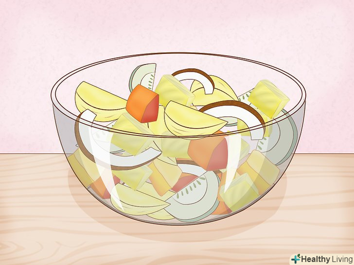 Спробуйте їсти дуріан з іншими фруктами.Дуріан чудово підходить для свіжих фруктових салатів. Наріжте дуріан дрібними скибочками і змішайте з іншими тропічними фруктами, такими як манго, папайя, гуава, кокос і ананас. Для більшої поживності можна навіть додати трохи горіхів і смаженої м'якоті кокоса.[13]