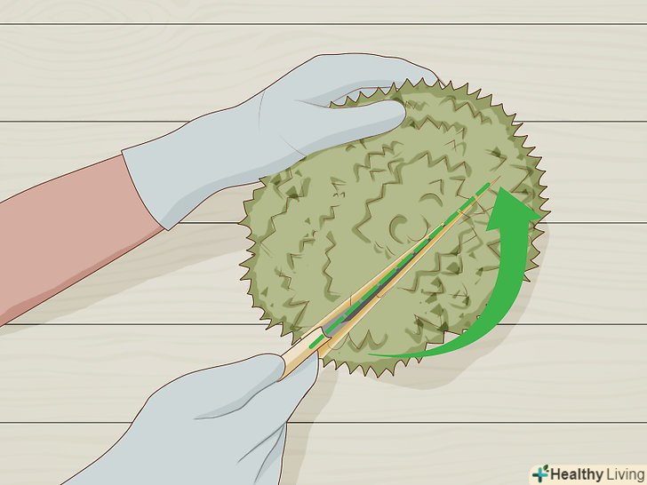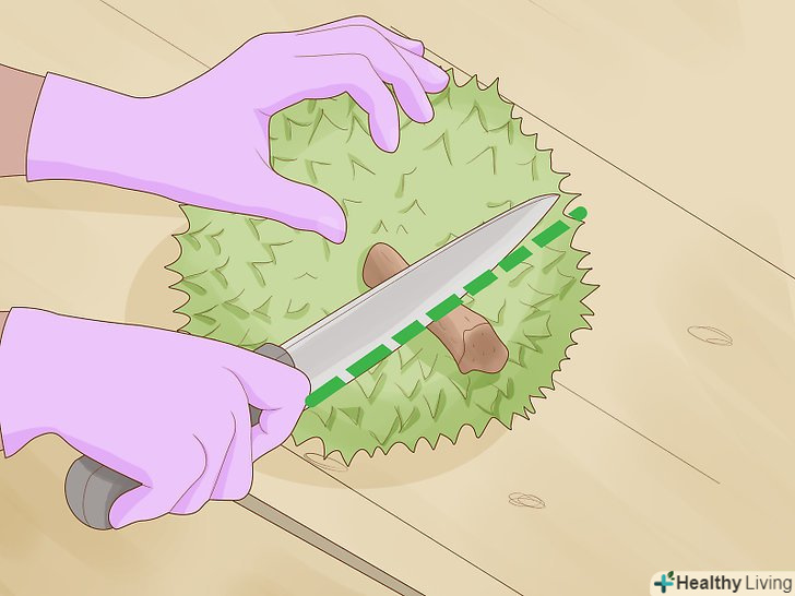 Одягніть рукавички.при обробленні дуріана це необхідно з кількох причин. По-перше, таким чином ви захистите свої руки від шипів, якими всіяна оболонка цього фрукта. По-друге, в цьому випадку ваші руки не просочаться запахом дуріана, який багатьом не подобається. І нарешті, в рукавичках ви зможете легше утримати фрукт, коли будете його розрізати.- Для захисту рук можна використовувати товсті гумові рукавички, чисті садові рукавички або навіть чистий рушник.[1]
