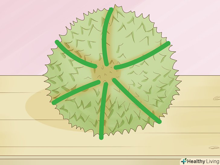 Визначте місця стиків.М'якоть всередині дуріана росте стручками, і зовнішня оболонка утворює часточки, які охоплюють ці стручки. Між цими часточками розташовані місця стиків, або" шви", за якими можна легко розрізати фрукт.- Стиглий дуріан зрештою розкривається по цих швах, так що іноді його взагалі не доводиться розрізати.[3]