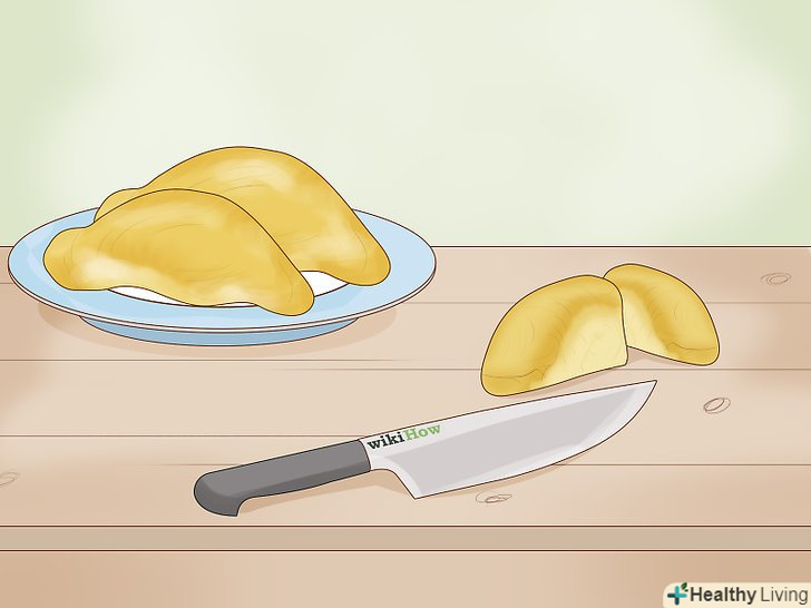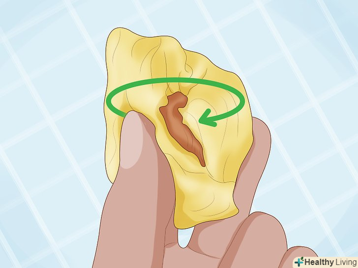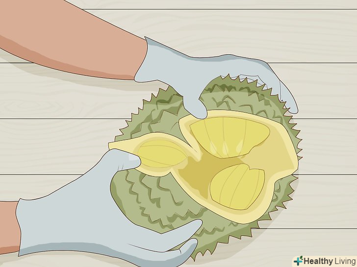 Дістаньте м'якоть.після того як ви розкриєте оболонку по швах, вона розпадеться на окремі часточки. Усередині кожної часточки буде їстівна м'якоть. Якщо дуріан стиглий, ви зможете легко відокремити м'якоть від оболонки. В іншому випадку розріжте гострим ножем волокна, якими стручки кріпляться до оболонки, і дістаньте м'якоть.- Їстівна м'якоть розташована в центрі кожної часточки, вона кремоподібна, має жовтуватий колір і за формою нагадує стручок.[6]