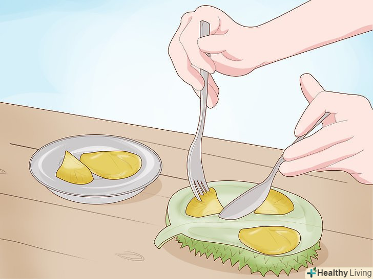 Їжте м'якоть руками.їстівна частина дуріана м'яка і схожа на крем, її легко можна розірвати на частини руками. Відірвіть від стручка невеликий шматочок і з'їжте його. Продовжуйте відривати м'якоть руками і є її.- В одній склянці (250 грамах) м'якоті дуріана міститься більше 350 калорій, велика кількість жирів і цукру. Разом з тим м'якоть дуріана багата і різними корисними речовинами, в тому числі вітамінами C і B6, залізом, марганцем, харчовими волокнами і калієм.[7]