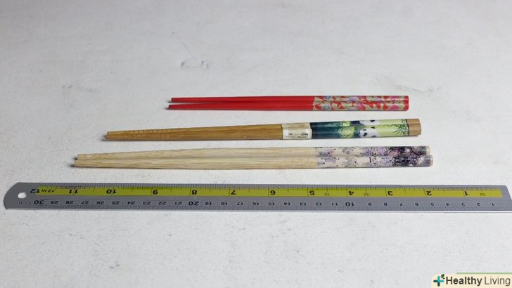 Знайте стандартну довжину.щоб правильно використовувати палички, важливо знати розмір паличок, що підходять під ваші руки. Є величезна різниця в паличках для рук дорослого чоловіка і для дитячих ручок.[3]- Стандартні палички в японському ресторані 23 см в довжину. Вони розраховані на розмір стандартної дорослої чоловічої руки.