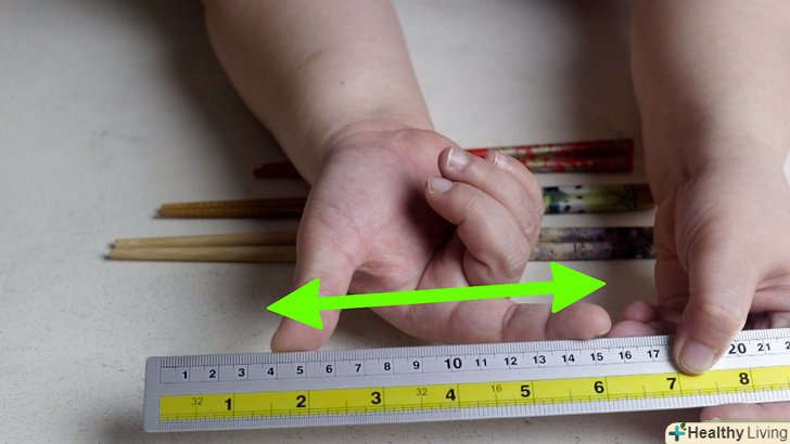 Виміряйте відстань між вашим великим і вказівним пальцями.виставте великий палець під кутом в 90 градусів до вказівного пальця. Виміряйте відстань від кінчика великого пальця до кінчика вказівного в сантиметрах.- Хоча і існують стандартні розміри, щоб вибрати правильний розмір, найкраще виміряти свої руки і вибрати палички відповідно до ваших потреб.
