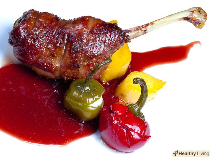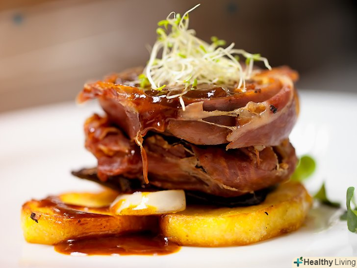 Обсмажте м'ясо і залиште його настоятися.багато м'ясні страви набувають дуже апетитний вигляд, якщо м'ясо спочатку було обсмажено. Побачивши стейка або шматочка смаженого лосося з хрусткою коричневою скоринкою у ваших гостей потечуть слинки. Але варто дати смаженому м'ясу полежати, перш, ніж його нарізати. Це дозволить соку вбратися назад в м'ясо, щоб все не розтеклося по тарілці.- З цього правила є винятки. Наприклад, якщо ви подаєте тушковану яловичину, доведеться подумати про інші креативних способах змусити м'ясо виглядати більш апетитно, навіть якщо воно не має хрусткої скоринки. Один з таких способів-подати його з соусом.